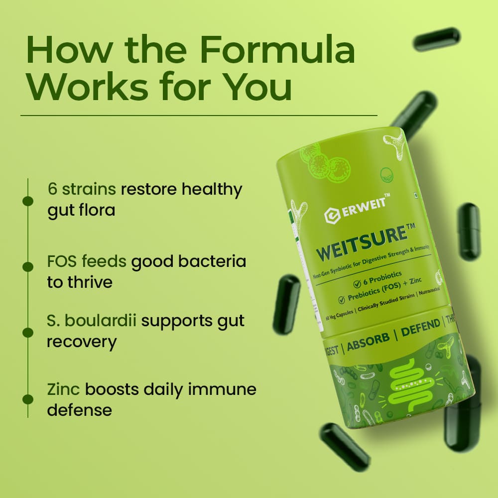WEITSURE™ is a next-generation synbiotic formula combining prebiotics, 6 clinically relevant probiotic strains, yeast probiotic, and immune-supportive zinc for complete gut, immune, and digestive health.